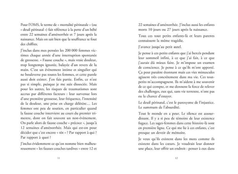 « Ces enfants aux vies minuscules laissent une empreinte immense, qui transforme à jamais ceux qui ont eu le privilège de les connaître. Leurs existences brèves nous habitent, leurs absences nous façonnent. Et il est temps de dire combien, dans leur fragilité, leurs vies sont grandes, et à quel point, ils nous manquent. »