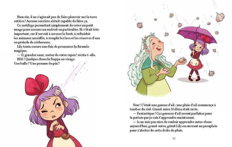 Lily est une apprentie sorcière bien dégourdie et elle aime plus que tout son rôle de gardienne de la forêt. Mais quand elle doit apprendre le sortilège de la pluie, soit le plus difficile de tous les sortilèges, c’est la catastrophe ! Elle fait pleuvoir des châtaignes, des confettis et des biscuits, mais pas de pluie….